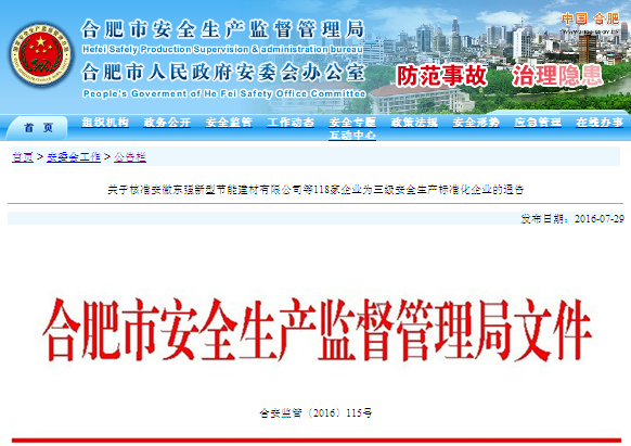 根據(jù)《國(guó)家安全監(jiān)管總局關(guān)于印發(fā)企業(yè)安全生產(chǎn)標(biāo)準(zhǔn)化評(píng)審管理辦法(試行)的通知》(安監(jiān)總辦〔2014〕49號(hào))等有關(guān)規(guī)定,經(jīng)安徽祥源安全環(huán)境科學(xué)技術(shù)有限公司現(xiàn)場(chǎng)復(fù)核合格,市安監(jiān)局決定核準(zhǔn)安徽東強(qiáng)新型節(jié)能建材有限公司等118家企業(yè)為三級(jí)安全生產(chǎn)標(biāo)準(zhǔn)化企業(yè),現(xiàn)予以通告。有效期自通告之日起3年。