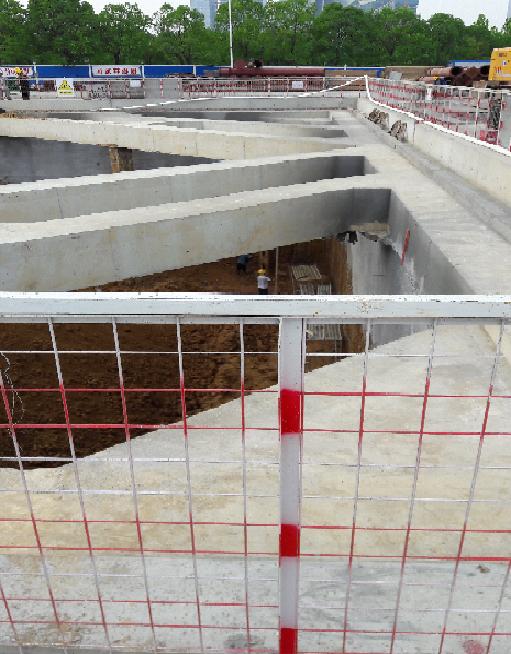 臺(tái),標(biāo)準(zhǔn)段主體結(jié)構(gòu)為地下二層單柱雙跨鋼筋混凝土框架結(jié)構(gòu),采用明挖順做法施工;車(chē)站總長(zhǎng)度193m,標(biāo)準(zhǔn)段寬度為20.7m,標(biāo)準(zhǔn)段基坑深度平均16.4m。